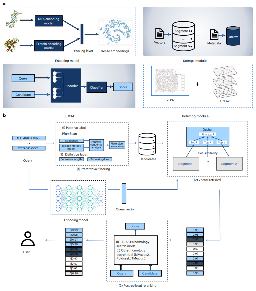 该研究开发的高效检索增强搜索工具——ERAST(efficient retrieval-augmented search tool),是一种旨在处理迄今为止最大的向量数据库中约 10 亿个生物序列的解决方案。ERAST 的核心创新在于巧妙地将前沿的大语言模型与高效的向量数据库相结合,为同源生物序列提供高效且精确的搜索。它通过整合预检索、检索和后检索优化阶段来提高搜索质量,并支持核苷酸和蛋白质序列。