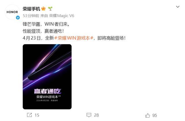 钱掌柜 荣耀WIN游戏本官宣将于4月23日发布