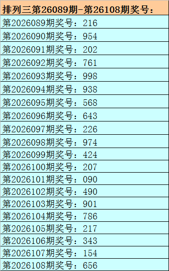 1.排列三最近十期分别开出号码:424-207-090-490-901-786-217-343-154-656,其中有8期奖号开出了上期的重复号码,本期预计第2026108期奖号:656中有重号,参考号码:5。